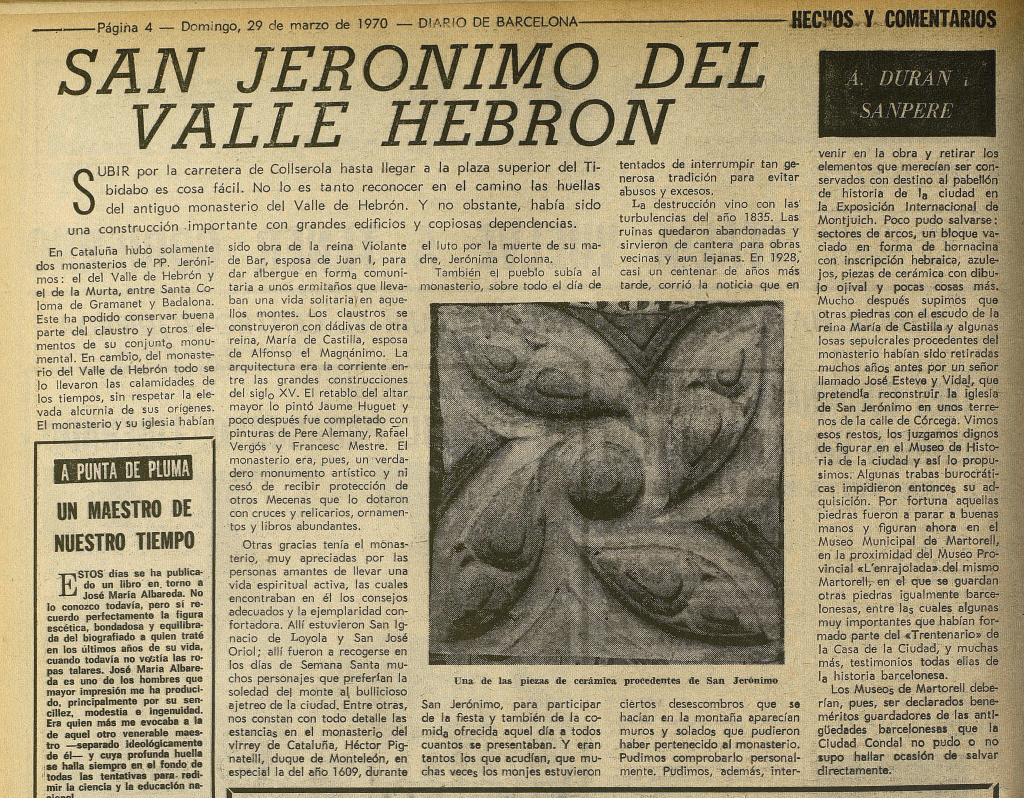 Agustí Duran i Sanpere escriví aquest article sobre Sant Jeroni de la Vall d’Hebron per al Diario de Barcelona. L’article aparegué el dia 29 de març de 1970. En el seu contingut parlava, de l’adquisició de diverses peces arqueològiques que suposadament havien d’anar destinades a l’exposició que es faria en el Palau de Barcelona, ubicat dins del marc de l’exposició internacional de l’any 1929.
