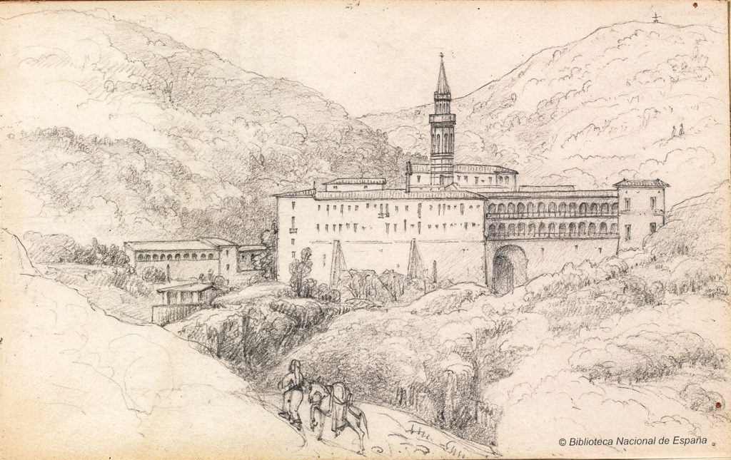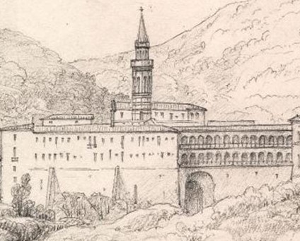El dibuix del monestir que ofereix més interès, és el que va fer George Vivian, amb una perspectiva presa des del camí de Sant Genís dels Agudells, és a dir des del costat mar. L’artista el va fer poc temps abans de la destrucció del monestir i del seu campanar.