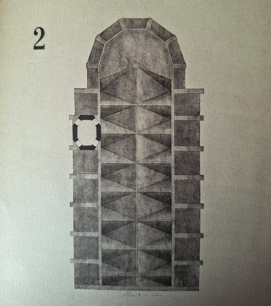 De seguida, ens podem adonar d’un aspecte important que ens condueix a una disquisició. Si tots els pisos, seguissin la mateixa traça que els dos pisos alts, la finestra del cos baix seria angular, cosa impossible, o gens probable en una construcció com seria la d’un campanar. Això, ens dona a entendre que la cara on estava construïda la finestra inferior havia de ser, amb tota seguretat, plana. Ara bé, si fixem la vista en els murs laterals d’aquesta finestra inferior apreciem que apareixen inclinats en el dibuix. És a dir que la base també podria ser poligonal, però de cares desiguals, ampla la central, estretes les laterals, i altra vegada, seguint la lògica constructiva, les dues cares suportades sobre els contraforts d’amplada igual a la del frontis. Tota l’estructura del cos baix del campanar estaria arrenglerada amb la façana exterior de les capelles laterals de l’església, sense sobresortir per fora.