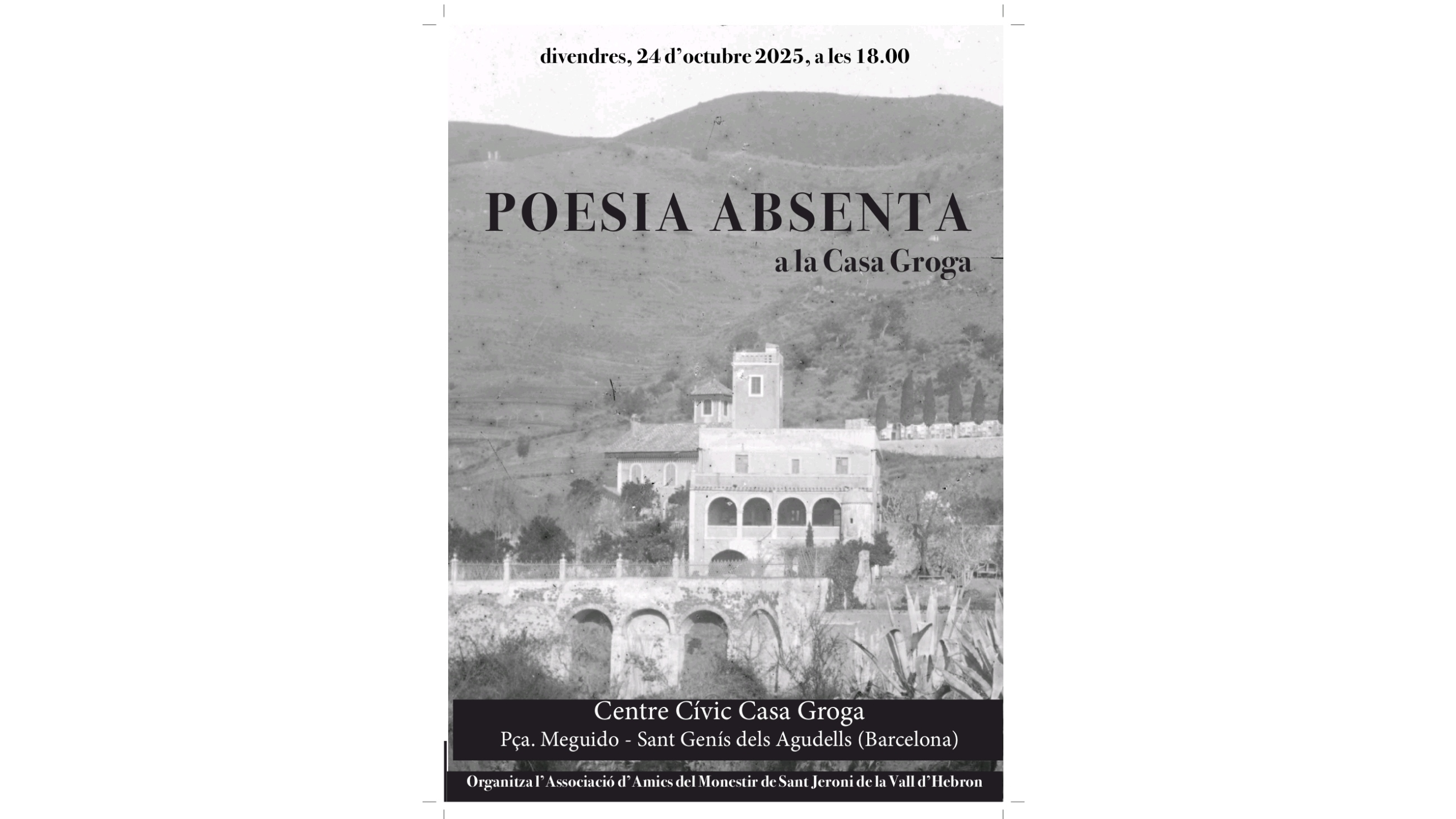 Jornada de Poesia feta el dia 24 d’octubre de 2025, titulada Poesia Absenta, al Centre Cívic de la Casa Groga del barri de Sant Genís dels Agudells i organitzada per l’Associació d’Amics del Monestir de Sant Jeroni de la Vall d’Hebron. En aquesta Jornada els poetes i poetesses Lali Vilert, Santi Subirats, Anna Maluquer, Josep…